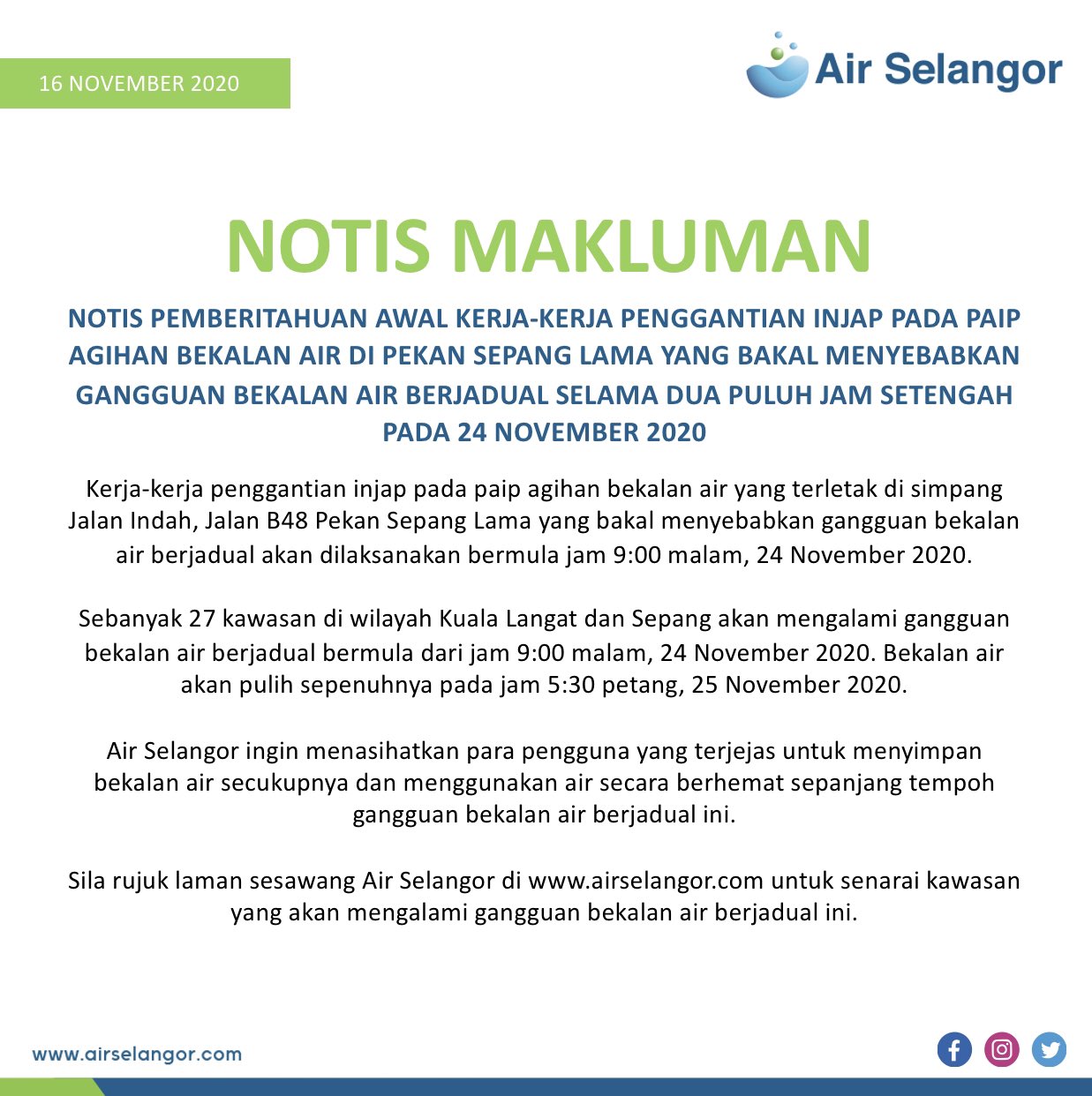 Notis Gangguan Bekalan Air Sabah 2020 Malaydodo from lookaside.fbsbx.com Empat loji rawatan air di selangor, iaitu sungai selangor fasa 1, fasa 2, fasa 3 dan rantau panjang dihenti tugas pada jam 7 malam tadi. Melansir laman webmd, air kelapa yang dikonsumsi secara berlebihan menyebabkan kadar kalium dalam darah menjadi terlalu tinggi. Gangguan bekalan air iti berlaku selepas empat loji rawatan air (lra) sungai selangor fasa 1, fasa 2, fasa 3 dan rantau panjang dihenti bertugas akibat pencemaran itu. Vasa cottage is located outside the places of attraction, spend lots of. Dapatkan maklumat semasa mengenai gangguan bekalan air berjadual dan tidak berjadual di kawasan anda. Tujuh wilayah berkenaan ialah kuala lumpur, petaling, klang/shah alam, kuala selangor, hulu selangor, gombak dan kuala. Berikut adalah notis status terkini masalah serta isu gangguan bekalan air untuk rujukan pengguna di seluruh negeri selangor, kuala lumpur dan putrajaya yang dikeluarkan oleh pengurusan air selangor sdn bhd (dulunya syabas). Harian metro 3 months ago.