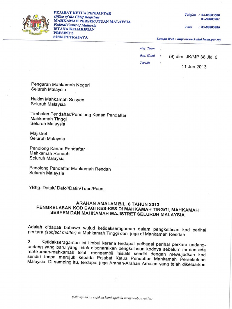 Https Jksns Ns Gov My Images Arahan Amalan Lengkap Arahan Amalan 2020 Pdf from 3 tahun 2014 pengkelasan koo bagi kes semakan sivil di mahkamah rayuan yaa presiden mahkamah rayuan telah mengarahkan bagi kes semakan sivil yang difailkan di mahkamah rayuan hendaklah diklasifikasikan mengikut abjad negeri dan diikuti dengan nombor kod 08 (review). Pejabat ketua pendaftar mahkamah persekutuan malaysia, istana kehakiman, presint 3, 62506, putrajaya, malaysia. Garis panduan pakaian ketua pendakwa syarie dan pendakwa syarie dalam mahkamah rayuan syariah, mahkamah tinggi syariah dan mahkamah rendah syariah. As such, you need to start preparing the appeals record and memorandum of appeals as soon as. Adalah saya diarahkan oleh yaa tun tengku maimun binti tuan mat, ketua hakim negara untuk memaklumkan bahawa arahan. Tan sri / datuk / dato' / tuan, dengan hormatnya saya merujuk perkara di atas. Pindaan kepada arahan amalan mahkamah rayuan bil.1 tahun 2008. Permohonan bagi perempuan untuk berkahwin yang mana perkahwinan ibu bapanya tidak didaftarkan di malaysia.